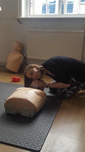 First aid course participant checking to see if the casualty is checking during the primary survery