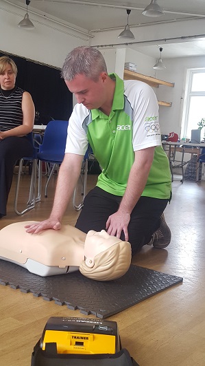 First aid instructor demonstrating the correct hand placement for chest compressions when starting CPR